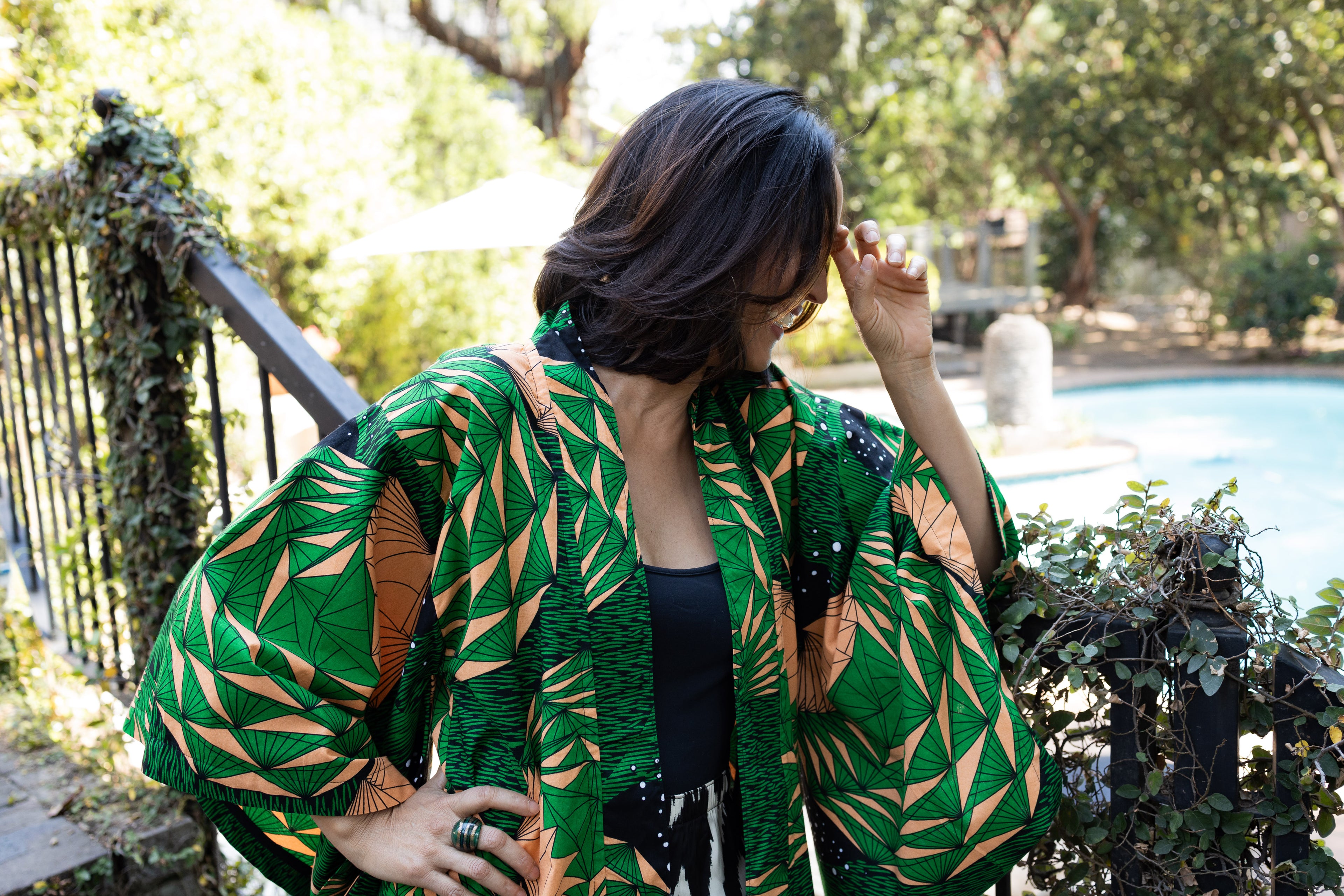 This versatile garment takes inspiration from the elegant lines of the traditional Japanese kimono, reimagined with the vibrancy of African fabrics.